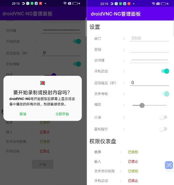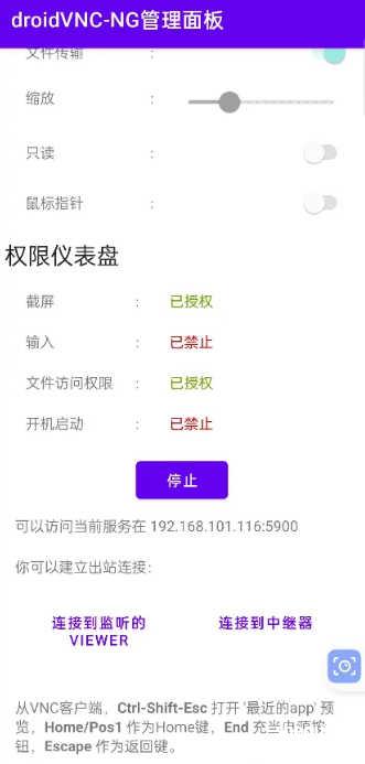 (5).droidVNC-NG还具有一些实用的功能,包括:Android权限处理、屏幕旋转处理、文件传输、密码保护、指定使用的端口等功能。还支持在设备启动时自动启动后台服务,方便随时进行远程访问。