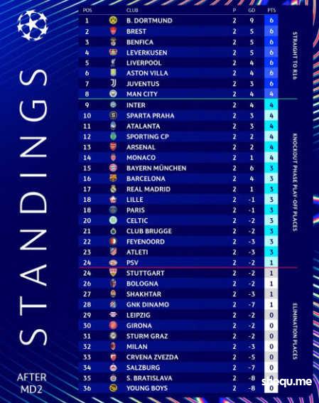 两轮过后,欧冠积分榜如下——